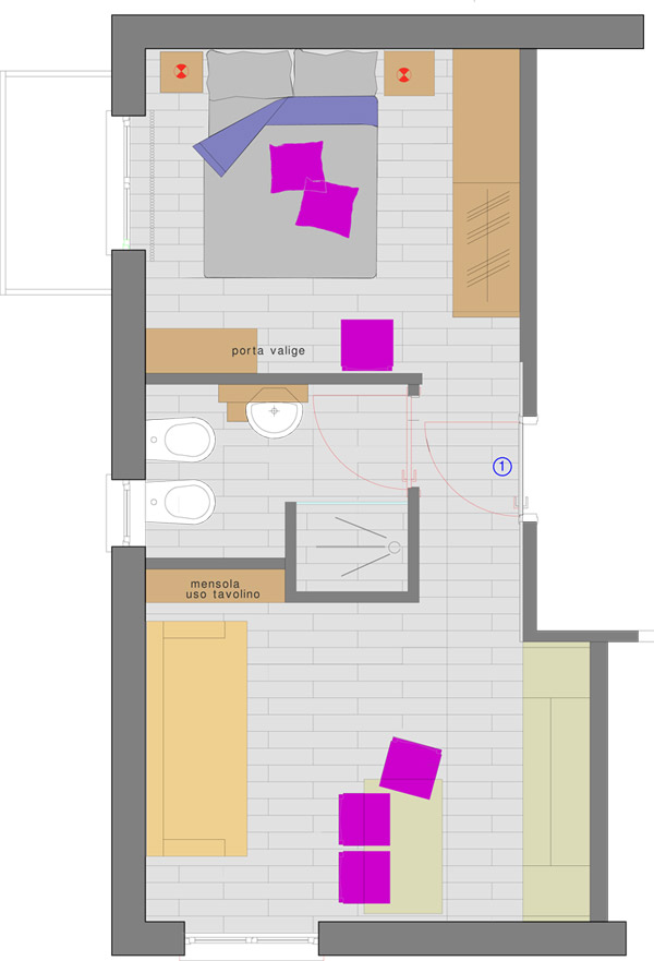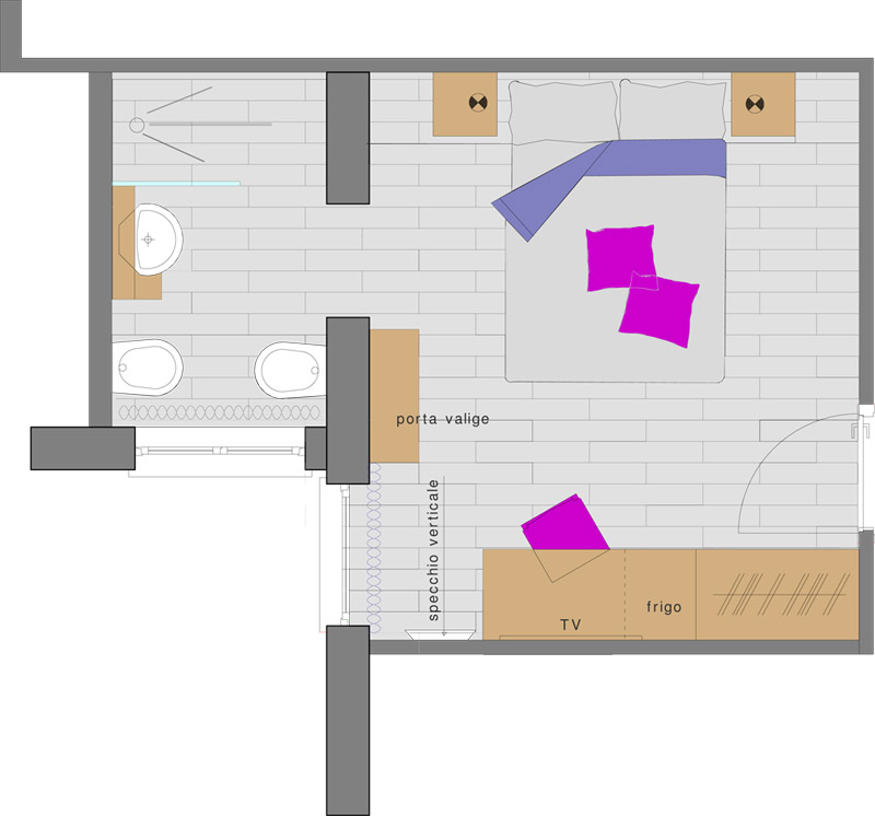1 stanza con letto matrimoniale o 2 letti singoli, bagno privato con doccia, asciugacapelli, set cortesia bagno, cassaforte, Wi Fi free in tutto l’Hotel, mini frigo bar,(anche per medicinali), 1 Tv Piatta 32” o 40”, Bollitore per caffè e tè in camera, clima e riscaldamento.